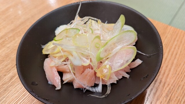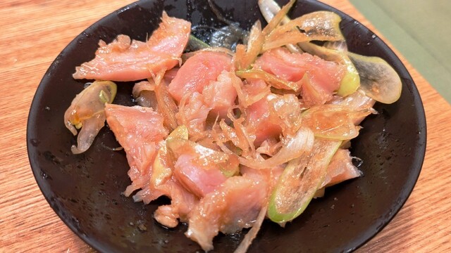 なめろうはねっとりした感じで旨味が強いの。タコはしっかりして食感で、マグロ皮ネギポン酢はコリコリっとした食感が素敵でした。