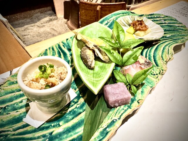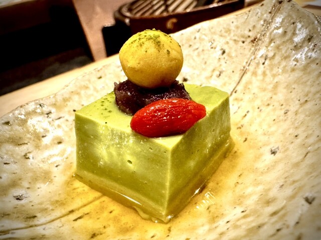 そんな事をつらつら考えていたら、仕出しと食前酒の到着となった。いよいよ宴の始まりである。抹茶胡麻豆腐、初めてのお味である。薄味の中に胡麻と抹茶が感じられる。上に乗ってる甘味と出汁とを合わせて頂くと、普通は一緒に頂かない組み合わせなのだが、オーケストラの様な不思議な一体感を感じる。出だしは優しいながらも意表を突く一品で、なかなか興味深いものがあった…。