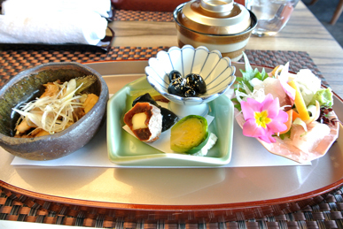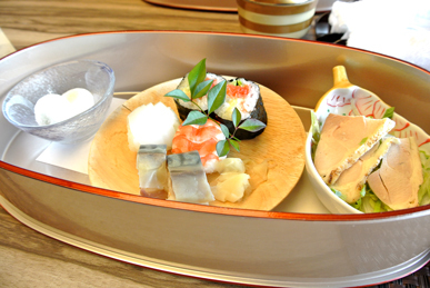 季節の前菜、プチサラダ、お造り、旬菜煮物、手毬寿司、水物、小さなデザート。