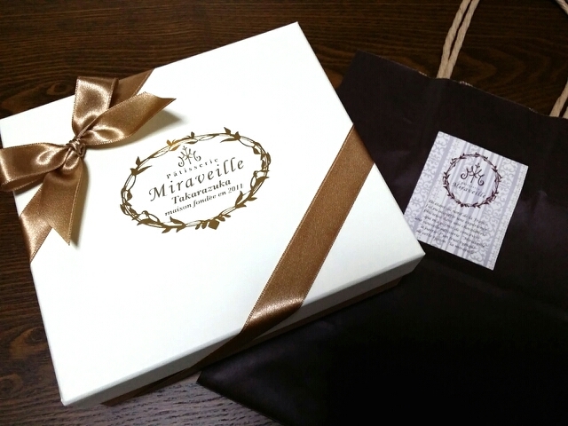 2017/06追記初訪問2014年。忙しくて更新できませんでしたが去年頃から私の誕生日や母の誕生日など折々で活用させて頂いております。いつ行っても季節などの節目にメニューの変化があって楽しい。多い時では週1、少なくとも月2以上は頂いています。主人がお土産に買ってきてくれることも!正直なところ、初訪問から益々お気に入りのお店になりました。※これまでの写真の一部を新規でアップさせて頂きました____パティスリーミラヴェイユ私の両親もたまに買いに来て、伊丹のラクロワの次にお気に入り~というお店です。宝塚市内は素朴系の美味しいケーキ屋さんが多いのですが珍しくフランス菓子系のパティスリー!店内はこぎれいで、かわいらしい雰囲気です。ケーキも体裁よく、キレイ。焼菓子の販売もありましたよ!で、で、この日ちょっとしたお土産用に焼菓子を買いに行きたいな~~っていうのが目的でこちらにお買い物にやってきたんですよ。い~っつも頂きっぱなしで恐縮な方には焼菓子を選んで、箱入りにして頂きました!ラッピングは決してハデではないけれど、スゴくキレイ!ちゃんと「Takarazuka」って地名が入っているのもミソです。スタンダードな紙袋に入れて貰ったラッピングも丁寧。それにビニールタイプの手提げ袋もオリジナルで可愛い。これならちょっとしたお土産にも買いに行きたいなあ。焼菓子を買った時に、そのお店の印象を伺い知ることが出来ます。やっぱり自分が貰ったら嬉しいラッピングをして頂けるお店はリピートしたいと思いますし、印象がいいです。*フレジェ 450円*ミルフォイユ 390円フランス菓子の王道を楽しめそうなピスタチオクリームと苺のフレジェと、シンプルな分厚いパイ生地とカスタードクリームのミルフィーユ状のスイーツミルフォイユを購入しました。こちらのフレジェはあっさりとしていて、ピスタチオの独特のクセが薄いです。個人的にはラクロワの「ねっとり濃厚系」の方が好み。ただ、父はこちらのフレジェの方がクセがなく食べやすいのでお気に入りだそうで。好みの問題ですね~~。ただ、こちらはこちらで美味しかったですよ。ミルフォイユはシンプルなんですけど、いやあ、これクセになる。カットがタイヘンなので素直に上から剥がして頂きました。この界隈なら素朴でシンプルに美味しいガトーマガザンヒグチが好きですが又ちょっと異なる印象。手土産の焼菓子購入も含めて、他のケーキも気になるのでまたリピートするかと思います。ごちそうさまでした~~