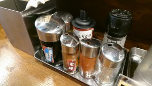 卓上には調味料各種、その中でも煮干しふりかけが気になります