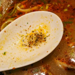 まず、辣油が混ざっていない清湯の部分を掬ってみます