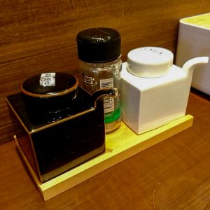 4.テーブルの上には黒酢以外にも、「レモン水」・「胡椒粉」あり