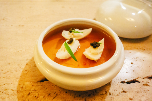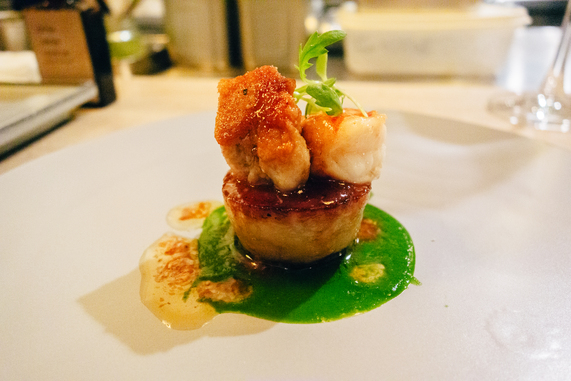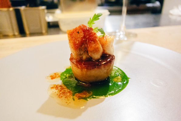 フォアグラのコク、帆立の甘み、ネギの香ばしさが重なり、酸味のあるソースが全体をきゅっと引き締めます。