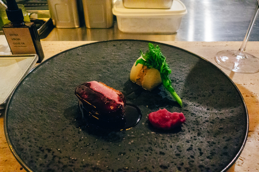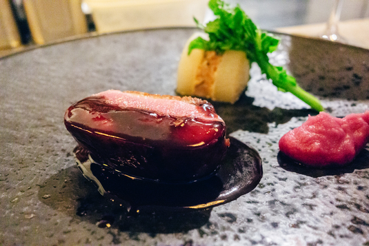 北海道産鴨肉のローストが本当に火入れが抜群で美味しい。付け合わせの鴨肉のハンバーグはまるでおでんのよう。赤キャベツとリンゴのピューレで仕上げたサルミソースが印象的。