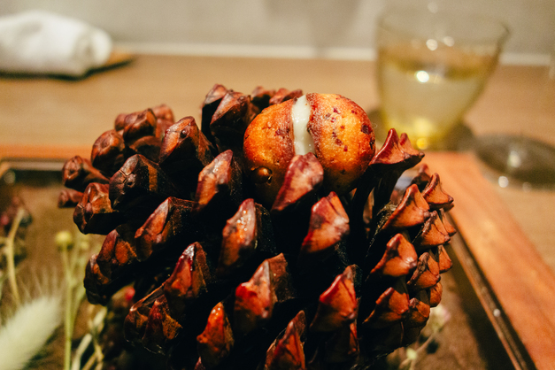 松ぼっくりの上にちょこんと乗せられた、遊び心たっぷりのケークサレ。