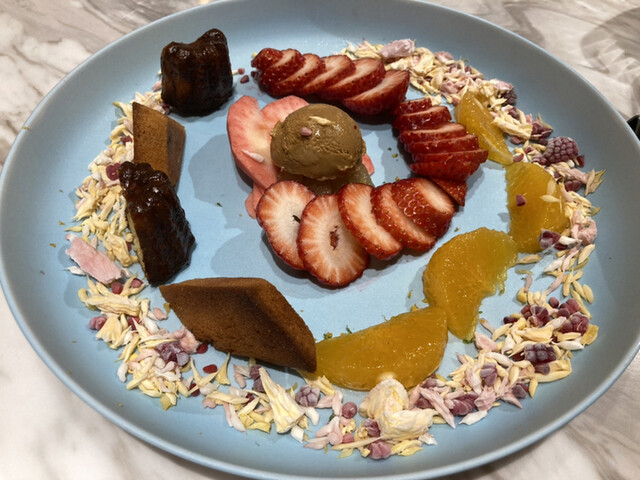 凍ったフルーツを砕いて、しばし安定させる間に盛り付けられていくプレートには、ふんだんな果物とカヌレ、フィナンシェ。