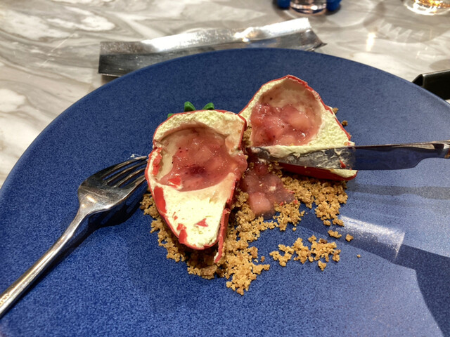 イチゴを割ると、中にはクリームとコンポートの苺が!!うぁお。