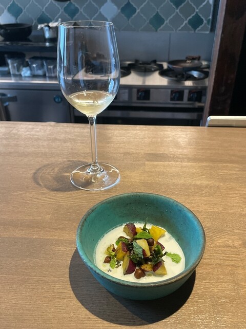 最初はさつまいも甘くて美味しいな、食材の組み合わせが珍しいなって印象。ペアリングの白ワインを飲んだら軽い香り付けポジションだと思ってたミントが風格の本領を大発揮。この料理の主役はミントなんじゃないかって思うほどにミントの使い方が巧み。司令塔であるとよさんが選手(食材)の活かし方が強過ぎる。