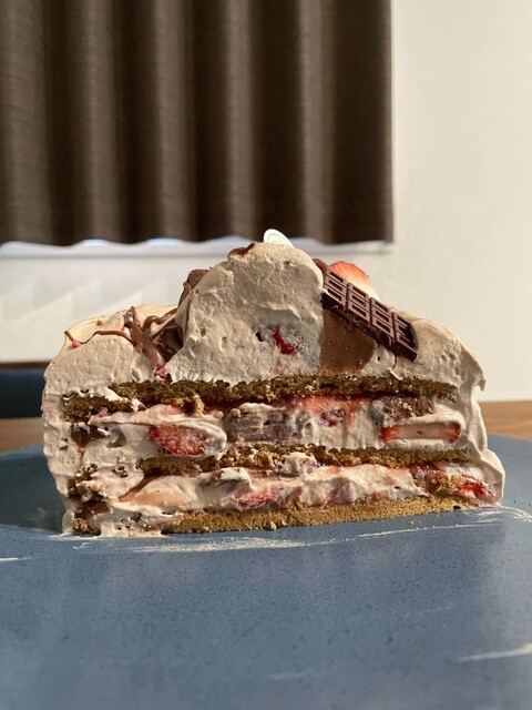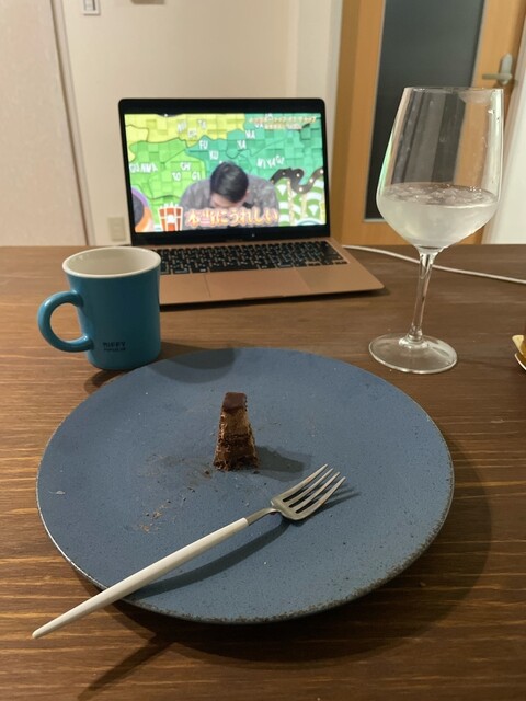 購入してから2日後、お昼ご飯のおやつにいただいたよ。テリーヌショコラはチョコレートの満足感が凄かった。ムース×ショコラスポンジのシンプルな構成で甘さ:ビターの主観的感想は5:5。ムースとショコラスポンジがそれぞれ0.5mmくらいの厚さでそれを何層にも重ねててフォークを入れるとミルクレープを食べる時みたいな手触り。大好きなキャラドゥとは全く違うチョコレートケーキで感動しちゃったよ。ホールで食べなきゃ。