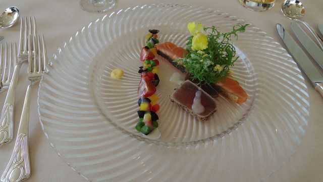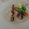 前菜の「サーモンのマリネと鮪のスモーク ニース風サラダ仕立て」は、サーモンの香りが良いマリネと、鮪の味わいがしっかりしています。サイコロ状にカットされた野菜がたくさんありサラダで柑橘系のドレッシングでした。