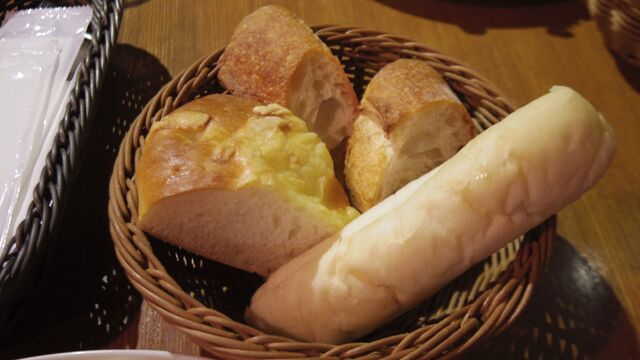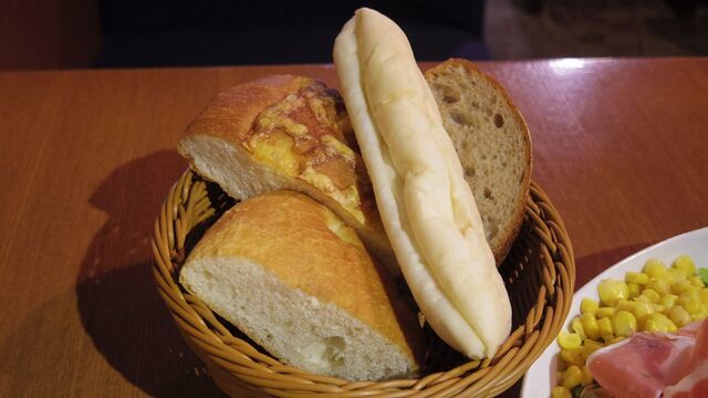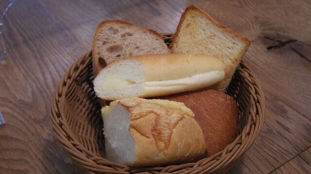 ランチに付いているカゴ盛りパンは、チーズフォカッチャ、バゲット2つ、ピーナツバターフランスです。