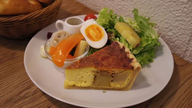 ワンプレートは、スモークサーモン・ほうれん草キッシュ、サラダ、ゆで玉子、キャロットラペ、ピクルスです。