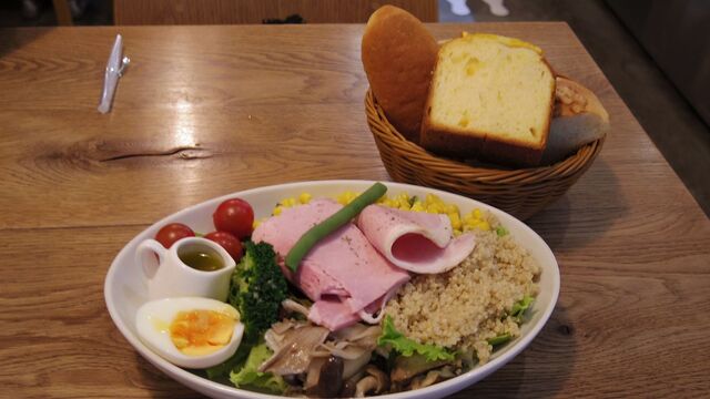 プレートはたっぷり葉物サラダにいつもの柑橘系ドレッシング、生ハム、キヌア、ゆで卵、ミニトマト、カマンベールチーズ、蓮根、にんじん、キヌサヤ、ミニキッシュです。