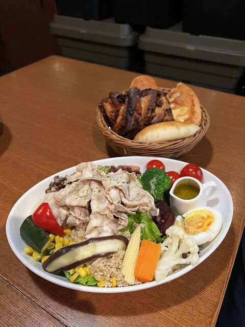 ランチのサラダは、たっぷりサラダプレートとパン盛り合わせ。