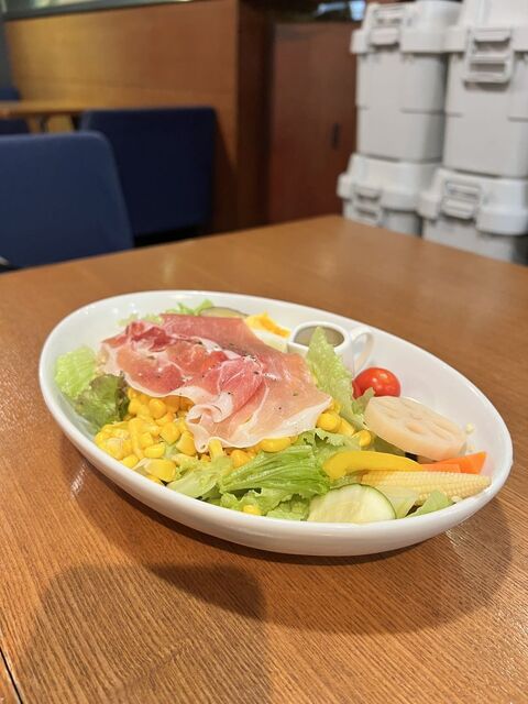 サラダランチ 生ハムは、ワンプレートで、大きな生ハム、たっぷりサラダ、ブロッコリー、ジャガイモ、スナップエンドウ、コーン、カブ、キヌア、ゆで玉子、ヤングコーン、豆サラダ、ピクルス、きのこのサラダ、柑橘のドレッシングです。