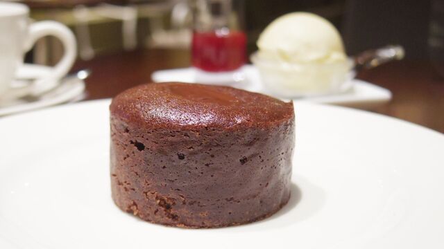 注文してから焼かれるというショコラムースケーキで、熱々で出され、もちろんカットすると中からチョコレートクリームがとろーっと流れ出します。