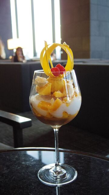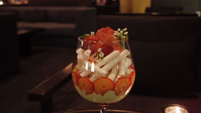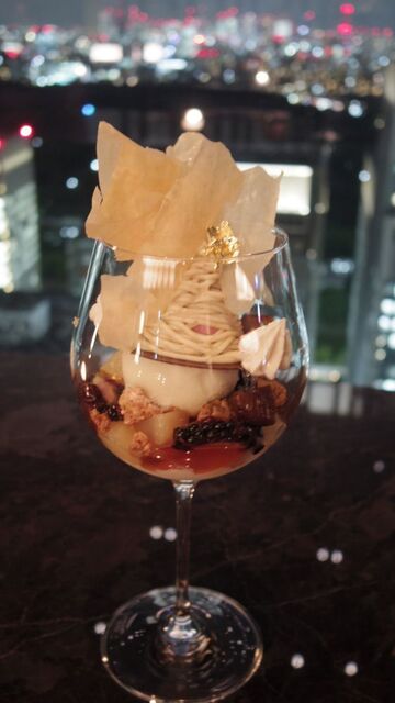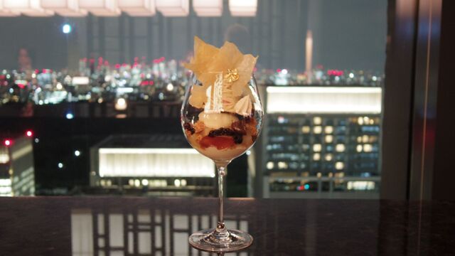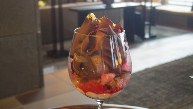パフェは、いつもの丸いボウルのワイングラスに盛りつけられています。