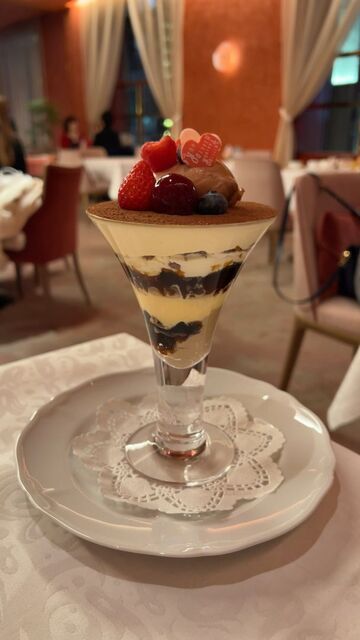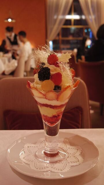 クリスマス限定のいろいろベリーとチーズのクリーム、ピスタチオアイスの飾りが華やかなパフェです。