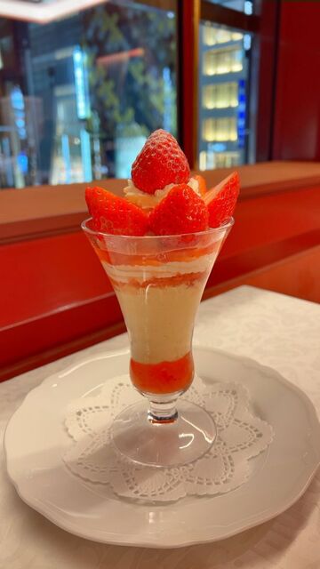 グラスの底のストロベリーソースは上のソースと同じと思われますが、より果肉感と酸っぱさを感じる美味しさです。