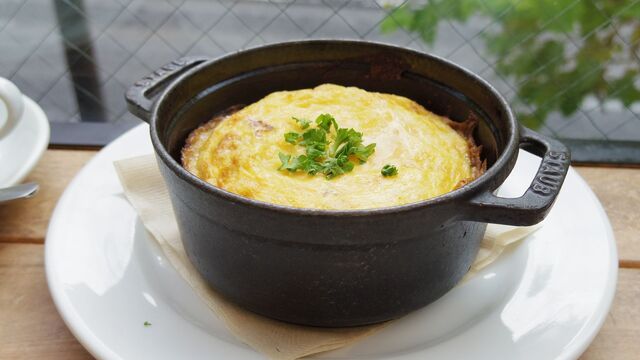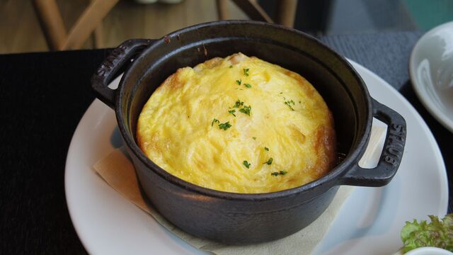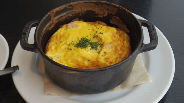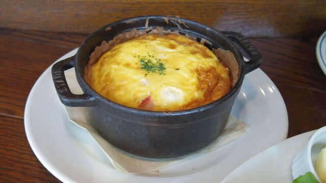 ココットで焼かれ熱々で出てくるチーズオムレツは、最初はふんわりしてチーズが伸びます。