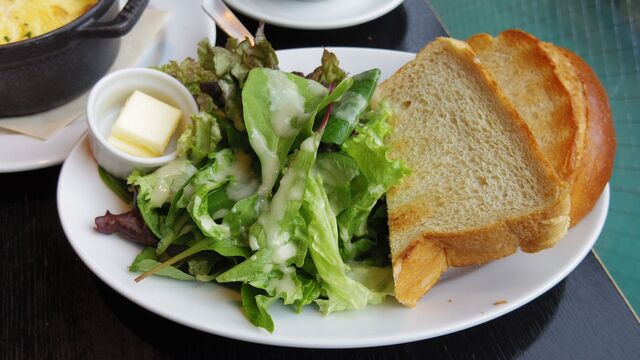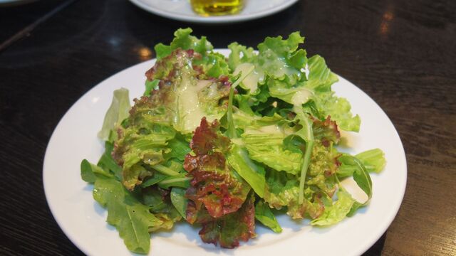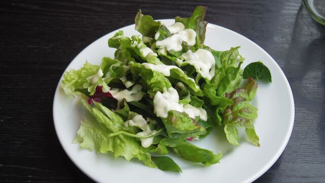サラダには白いフレンチドレッシングがかかっていますがさらにオリーブオイルをかけるのが好きです。