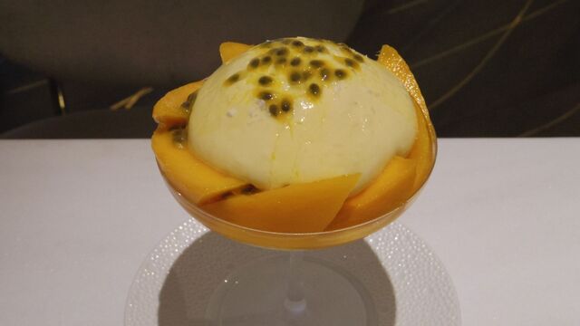 パッションフルーツの種入ソースののったマンゴームースは、しゅわしゅわして軽い口当たり。