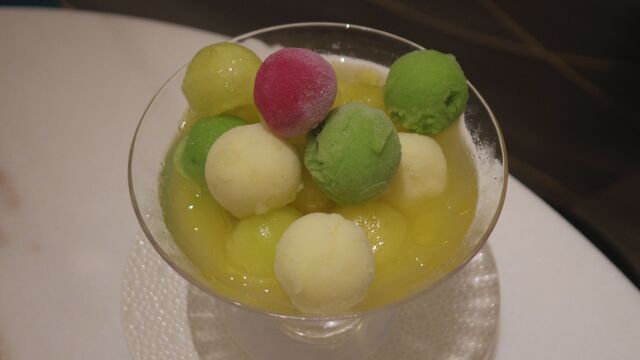 静岡マスクメロンのクープ アーモンドのブランマンジェ ミントのソルベは、クラウンマスクメロンを丸くくり抜いた果肉タップリのパフェです。