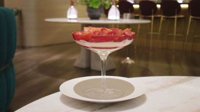 八月から銀座店で提供が始まった、ピーチメルバのパフェ。