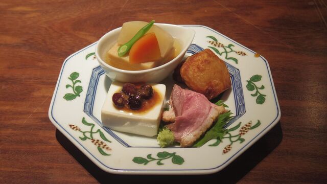 前菜四種盛りは、高野豆腐、揚げ里芋、冷や奴、鴨のたたきです。
