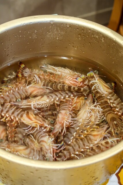 鍋が煮立ってきたところでクルマエビ登場!やっぱり自分たちのだった♪お酒に漬け込んであるので熱い鍋に放り込んでもあまり暴れないんだとか。それにしてもデカいクルマエビだ・・・。