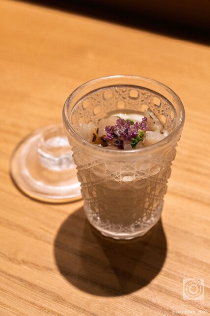 箸休めに出されたのは「新玉ねぎと湯葉のムース」。とっても滑らかで玉ねぎの甘さが存分に引き出されたムースの中に湯葉のクリーミーさがとってもよく合う。タイラガイの貝柱の仄かな甘さもいい。