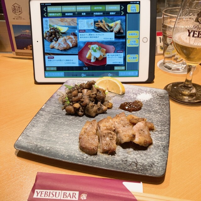 1,2月の「福の神 にっぽん食探訪」は鹿児島フェア。お目当ての料理は、黒豚とさつま知覧どり2種盛り合わせ!月間ランキングの特典を使用し無料で頂きました。2種共に絶品でしたが、とりわけ親鳥が大好物の私にとって知覧どりは嬉しかったです。レモンはエールの味変用、ちゃんと再利用しました。ご馳走様でした。
