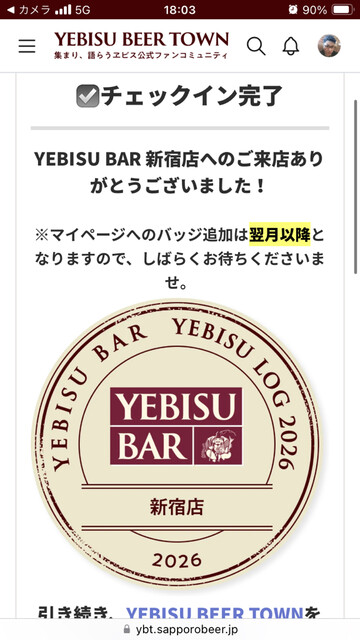 最初のヱビスを飲んだ際、ビールの30マイルと来店60マイルが同時に付与されますが、ノンアルなので来店マイルのみ別途頂く形になります。本日と同じく数年前にグランスタ八重北店ぶりだろうか。