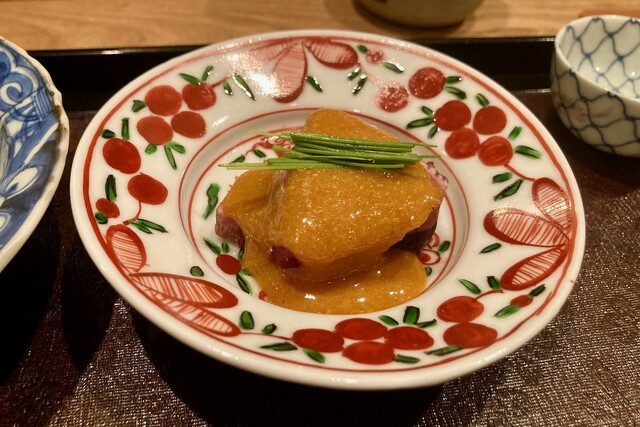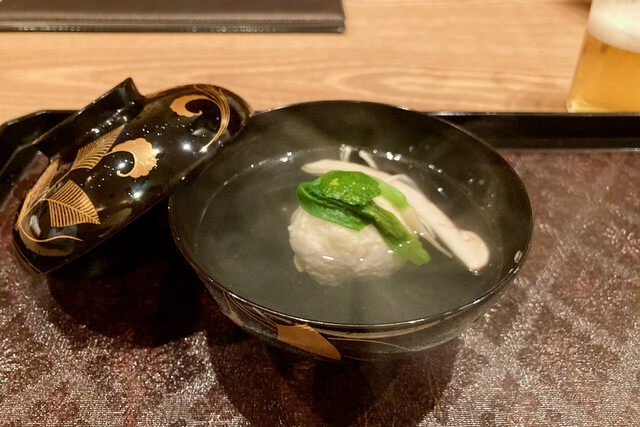 『山形県産どだれ芋、滑子、九条ネギ、飛騨牛サーロイン』の煮物では、やはり土垂のもつ煮崩れしないしっとりとした食感と、滑子のとろんとした滑らかさが、濃厚でありながら煩わしさのない味わい。その間には、飛騨牛の芳香が漂い、強烈な引力で客人を虜にします。これらの素材を活かす大将の繊細な技に、ただただ感嘆せずにはいられません。