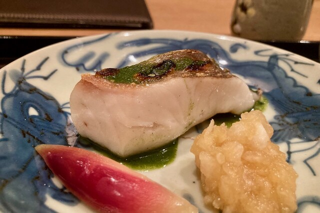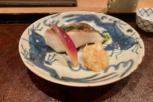 次に供される『真魚鰹の炭火塩焼き』は、厚みのある白身に脂がよく乗り、ほろりとほどける食感。真魚鰹(まながつお)の名に相応しいその優雅な味わいは、茗荷の甘酢漬けと林檎大根おろしを添えることによって、さらに引き立ちます。真魚鰹はその名の由来にもあるように、古くから高貴な味の代表とされ、今もなおその名声を保っています。
