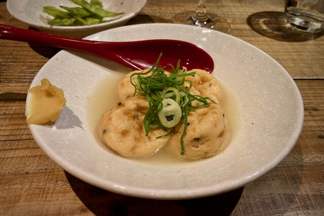 『鶏だしがんも』は、供された瞬間に立ち上る湯気が印象的でした。割ると中までしっかりと熱が入り、鶏出汁の旨味がじんわりと染み出してきます。表面の色味から一瞬バターを想像しましたが、実際には鶏油由来と思われるコクで、重さは感じません。口当たりはふわりとしており、日本酒との相性も良好です。