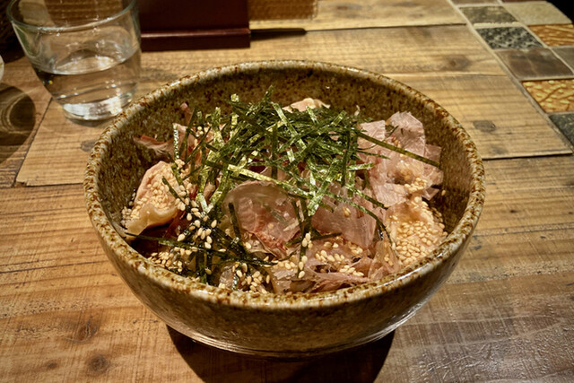 締めに選んだ『十割そば』は、勝手にざるそばを想像していたところ、花鰹がたっぷりとのった温かい汁そばで登場しました。口にすると、ほんのりと胡麻油の香りが立ち、どこかで食べた記憶を呼び起こします。《港屋》を思わせる方向性ですが、過度に寄せることはなく、あくまで居酒屋の締めとして収まっています。