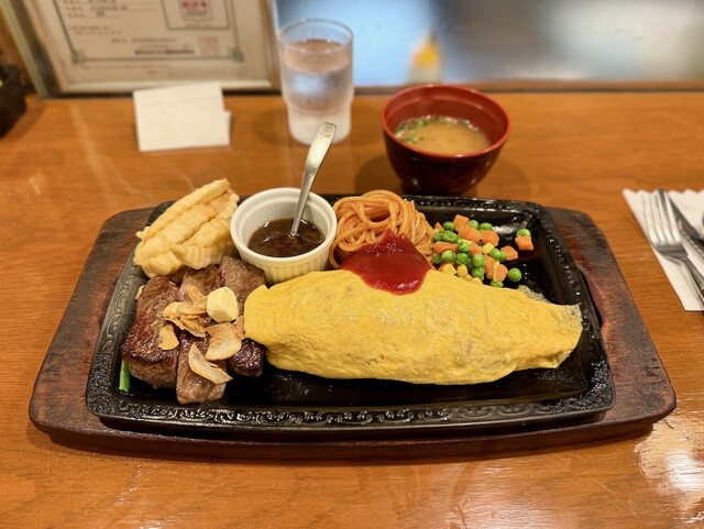 同じ皿の『オムライス』は、包まないタイプ。豚バラの旨味が米粒に移り、ケチャップの酸味が全体をまとめます。ボリュームはしっかりで、サラダと味噌汁を挟みつつ進めると、ステーキの150gでも満足感が高いです。次回は肉量を抑えて別の洋食を合わせるのも一手だと感じました。