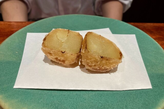 特筆すべきは『メイクイーン』。前回も供されたこの一品は、この店のスペシャリテ。揚げ始めから最後に供されるまで、長い時間をかけて準備され、手間を惜しまず仕上げられます。外はカリッとした衣が黄金色に輝き、中は蜜のようになっており、しっとりホクホク。この絶対的なバランスは、職人の手技の賜物です。素材そのものの持つ風味を余すことなく引き出しており、一度食べたら心に残る美味しさです。
