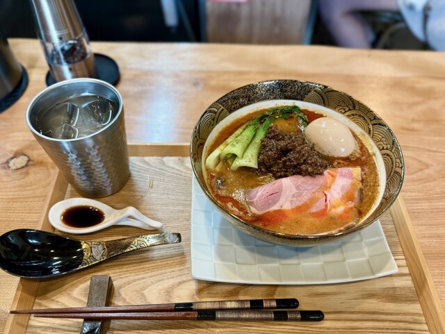 次にいただいた『担々麺』は、彩りの良い具材が賑やかで、特製の黒酢ソースが添えられる仕様でした。辛さは控えめで、胡麻のまろやかさが主体となり、痺れはほとんど余韻程度にとどまります。挽肉はしっとりとして量も十分で、溶け込むほどにコクが深まっていきますが、途中で黒酢を垂らすと輪郭が整い、軽やかに感じられました。味玉は黄身が柔らかく、全体の流れをやさしく受け止める存在でした。
