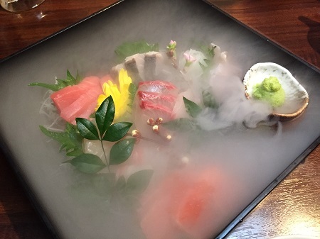 煙の中から、見るからにおいしそうなお造りが顔を出しました。