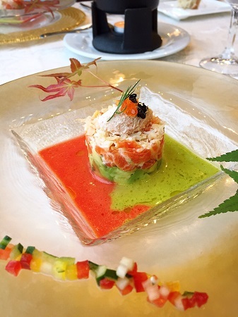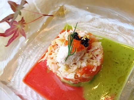 ■タラバ蟹と八幡平サーモンのミルフィーユ2色のキャビア添え