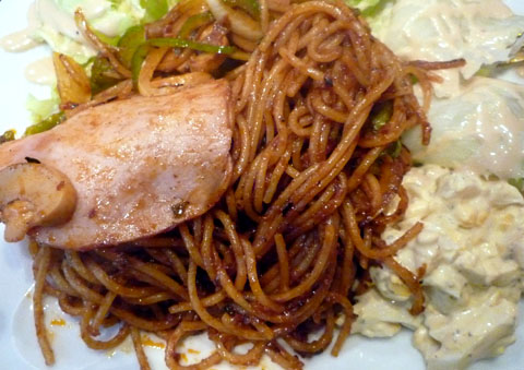 見た目はフツーの焼きそばだが、味も至ってフツー。しかしソースでベチャッともせず、ところどころお焦げもある。具は豚肉・キャベツ・もやしがやや少量ぎみながら、ややモチっとした中太麺の食感もいいし、非常によく出来てると思う。