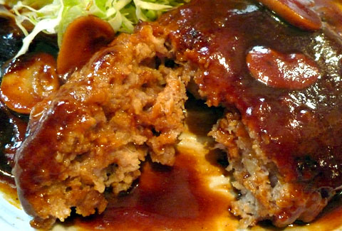 ハンバーグ自体は超柔らかい代物。ソフトで箸にも歯にも抵抗が殆どない。つなぎもそこそこあろうが、肉々しさは損なわず、つなぎばかりがパスパスの味や食感にならず、うまいことソース含め全てが渾然一体となって口中でフワッとトロける。
