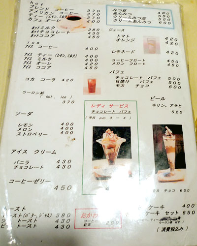 いやフツーにバナナをミキサーにかけた代物なのだろうが、こうした喫茶店でないと、バナナの香りづけをしただけのようなマガイモノが平気で出てきかねない。濃厚なバナナ特有の香りもよく、これで500円未満というから恐れ入る。