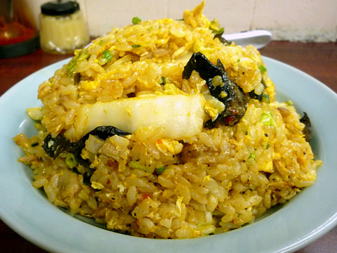 食べてみるとこれがもう絶妙な味わいとシットリ加減。キムチの水気が加わることで、まるで計算されつくされたかのような適度なシットリ感が生まれる。さらに食感的にも具のアクセントが加わることで、食べごたえが生まれる。どうしてもこの手のメニューは具があればあるほど本来の炒飯との馴染みが悪く、食感的にも味的にも食べれば食べるほど2つの要素が乖離してくるのだが、これは分量もバッチシで全然分離してる感じがない。