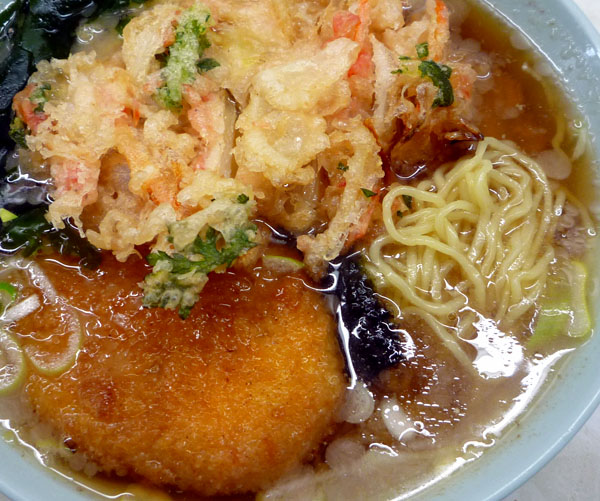 そばもさることながらラーメンも人気で、立ちそばでラーメンということは、フツーラーメン屋では出来ないトッピングが可能、ということで早速トライ!