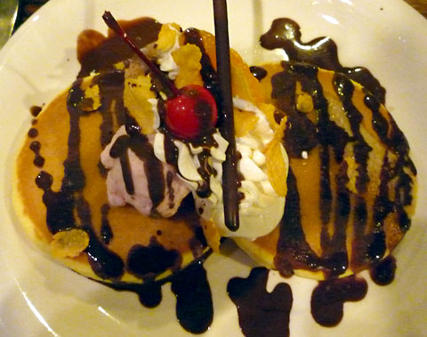 ホットケーキに、ココアの上の部分をトッピングしただけ。完全にドリンクとカブってるし!
