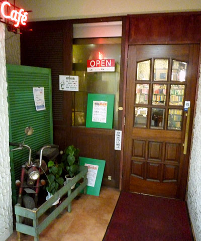 はやる気持ちを抑えて階段を登ると入口に到着。ネオンのCAFEの文字が70〜80年代的なテイストを感じさせる。